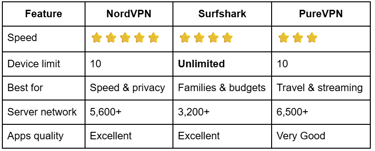 Quick comparison: PureVPN vs. Surfshark vs. NordVPN