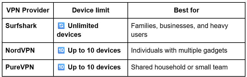 NordVPN and PureVPN allow up to 10 simultaneous devices, perfect for most users.
