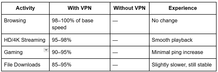 In real-world testing, users often experience less than 5–10% speed difference when connected to nearby VPN servers — virtually unnoticeable for streaming, gaming, or video calls.